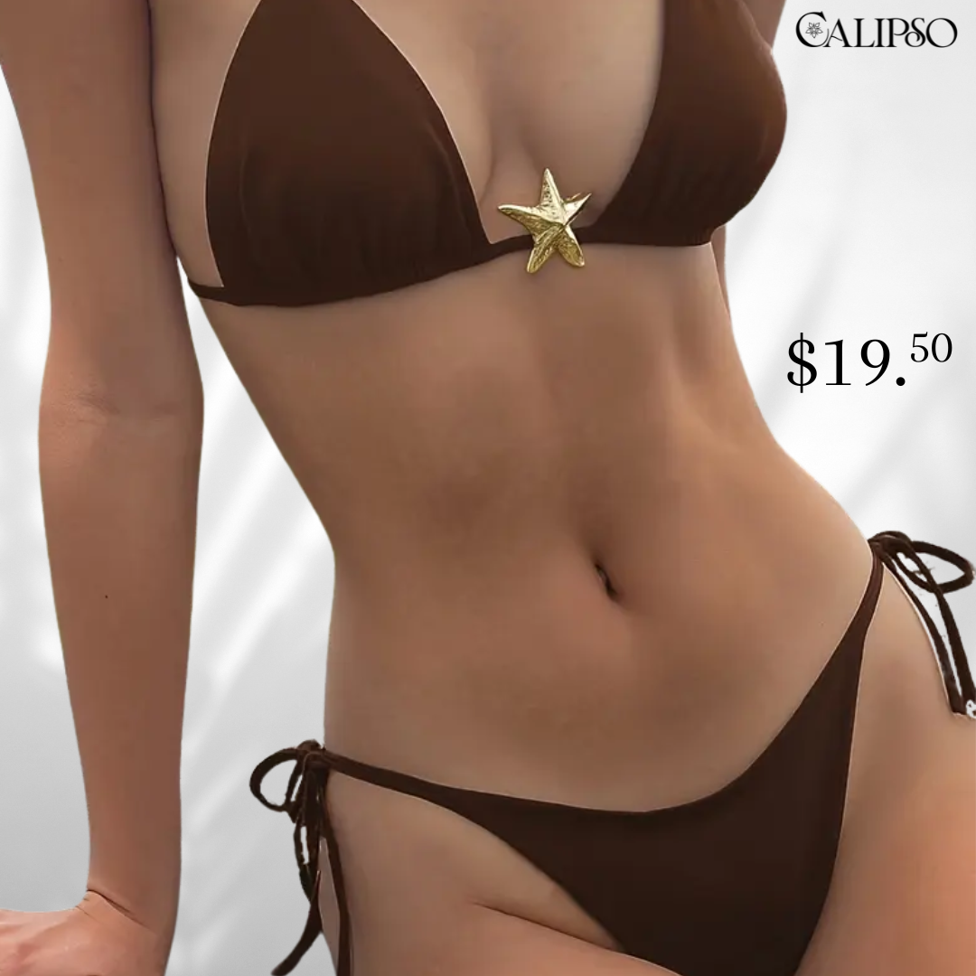 Bonito traje de baño de dos piezas, traje de baño de amarrar en ambas piezas, diseñado en un solido color Café o su variante en color negro acompañado de un dije en forma de estrella en el frente del top, prenda de secado rápido.