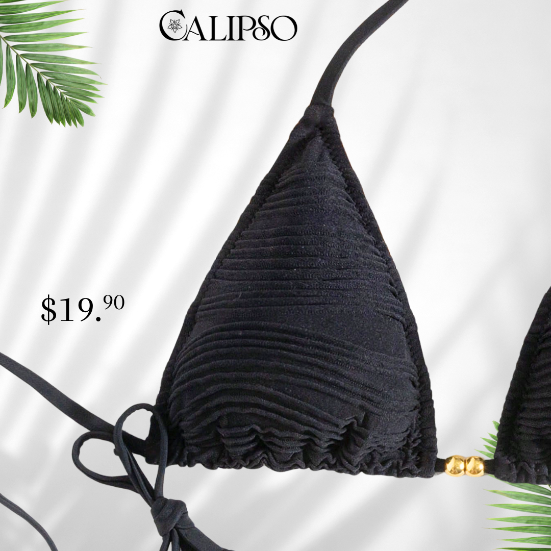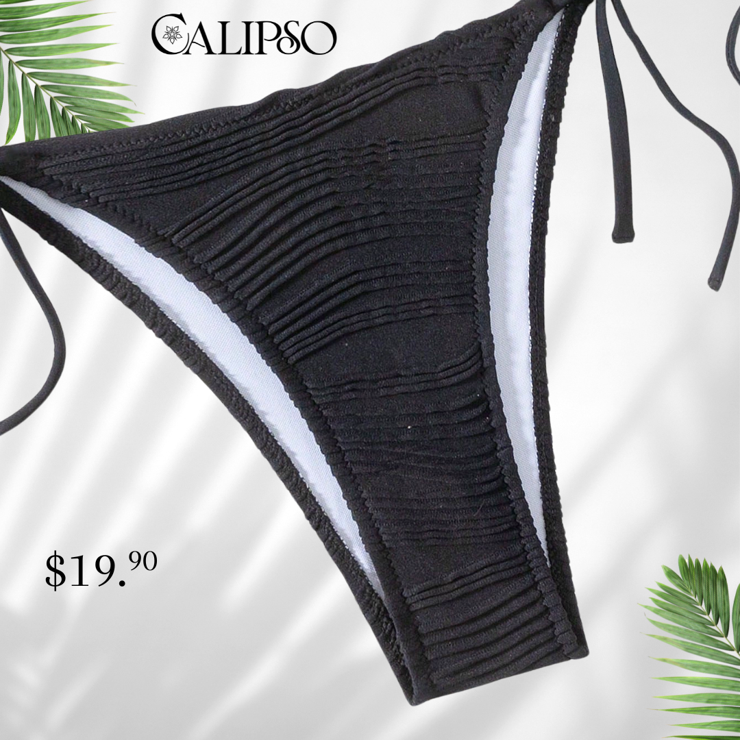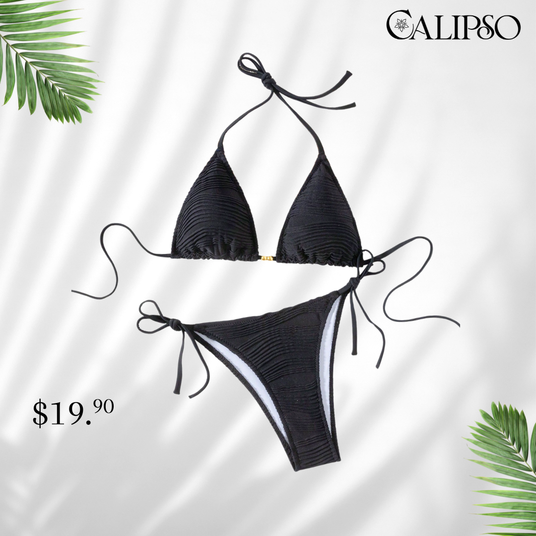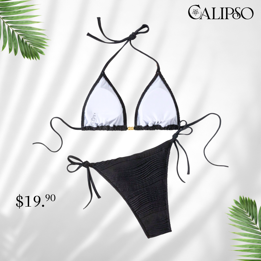 lindos diseños de trajes de baño en dos diferentes presentaciones traje de baño de amarrar, con textura en su tela y ambos diseños decorados en sus top confeccionados en dos colores negro solido y beige solido .